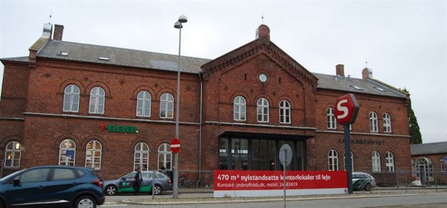 Den nyrenoverede stationsbygning med S-togsskiltet foran.