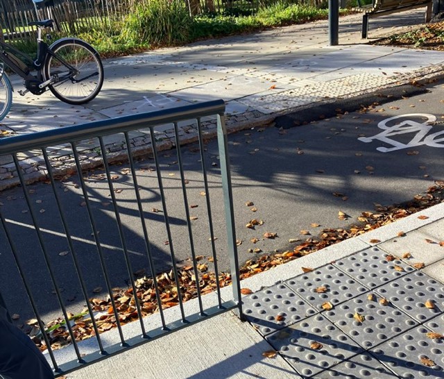 - er med til at skabe sikker overgang over cykelstien for fodgængere. Overgangen er også en del af tilgængelighedsudstyret på stationen.