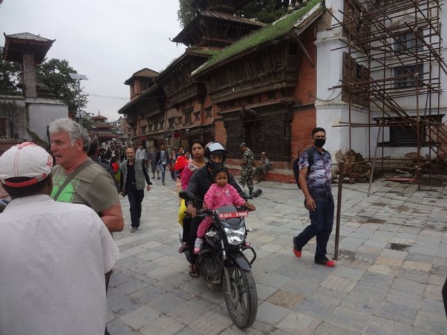 Fodgængere og familie-motorcykel i Kathmandu, Nepal.