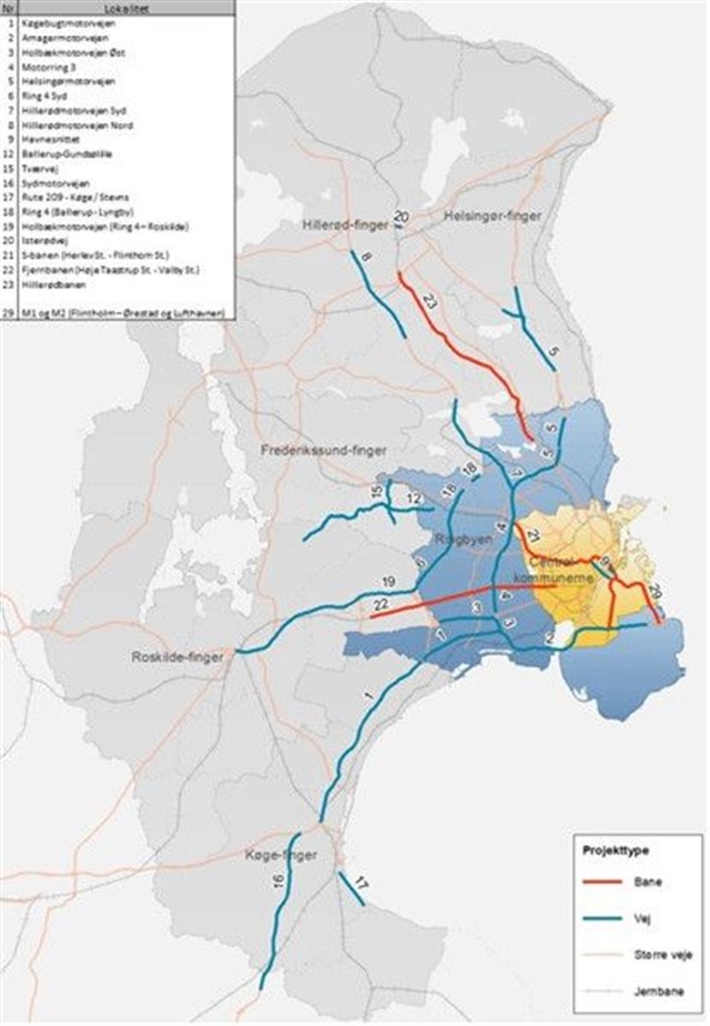 Vej- og banestrækninger med trængselsudfordringer i 2035 i et basis-scenarie uden investeringer i nye infrastrukturanlæg
