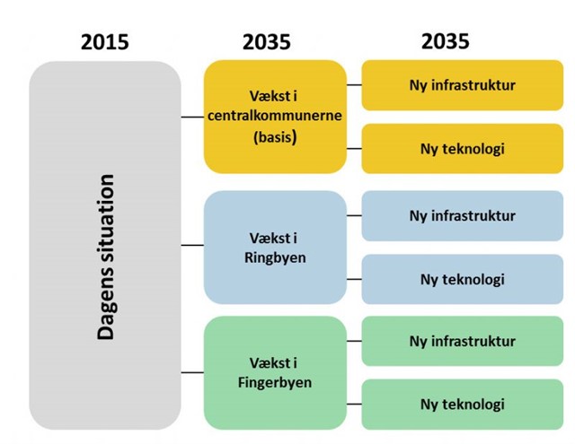 Analysens design med tre byvækst-scenarier og under indflydelse af hhv. ny infrastruktur og ny førerløs køretøjsteknologi frem mod 2035.