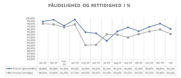 Pålideligheden i december endte på 98,1 procent. Det var anden måned i træk med markant fremskridt og første måned siden april med et resultat over 98 procent. Grenaabanen bidrog positivt med en pålidelighed på 98,4 procent.