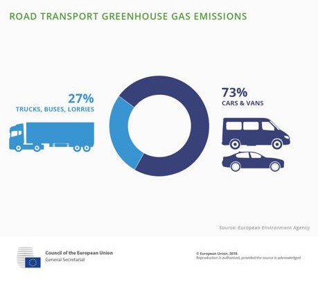 Natten til tirsdag blev EU’s ministerråd ledet af det rumænske formandsskab og EU-Parlamentet enige om en aftale, der stiller krav til nye lastbilers CO2-udledninger. I forbindelse med enigheden har EU’s ministerråd offentliggjort nogle grafer, der viser, hvordan transportsektorens udledninger fordeler sig på de forskellige transportformer