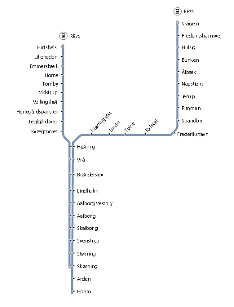 Region Nordjylland har indgået en aftale med Transportministeriet om at forlænge den regionale togdrift til Hobro. Det betyder. At Nordjyske Jernbaners blå regionaltog kører på strækningen fra Skagen og Hirtshals til Hobro. Regionaltoget RE75 kører fra Skagen til Hobro hele driftsdøgnet, mens Regionaltoget RE76 udvides, så der køres fra Hirtshals til Skørping på hverdage i dagtimer. Både RE75 og RE76 standser på alle mellemliggende stationer.