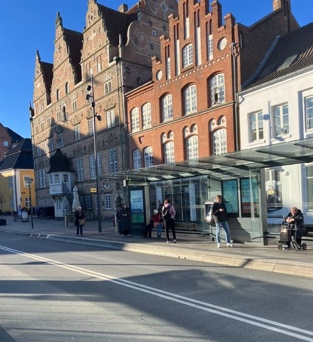 med Aalborg-attraktionen Jens Bangs Stenhus i baggrunden. Bemærk den skrå kantsten og stationens lette design.